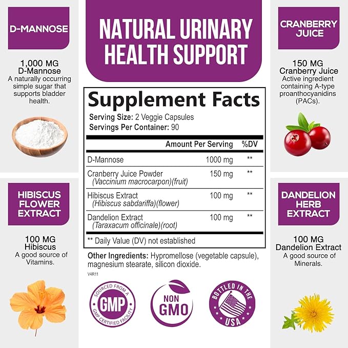 - Flush & Cleanse Naturally: D-Mannose, a naturally occurring sugar, and cranberry’s A-type proanthocyanidins work together as nature’s duo for urinary tract and bladder health support, combined with the antioxidant properties of hibiscus and dandelion for unmatched effectiveness
