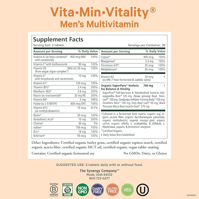 PURE SYNERGY Vita·Min·Vitality | Natural Multivitamin for Men | Men’s Daily Multivitamin Made with Organic Whole Foods | for Energy, Stress, and Immune Support (60 Tablets)