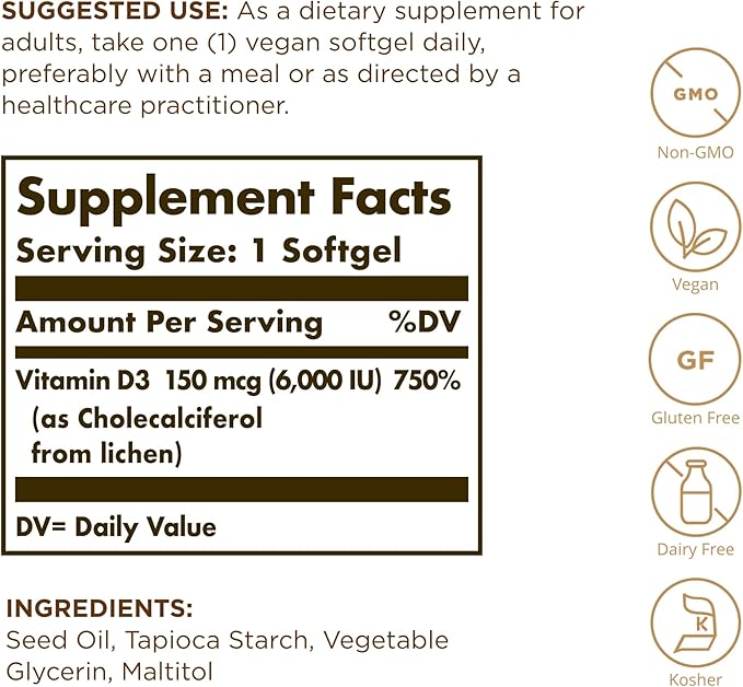 - Immune System Support; Solgar Vitamin D3 (Cholecalciferol) 150 mcg (6000 IU) Softgels support a healthy immune system and neuromuscular function