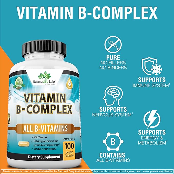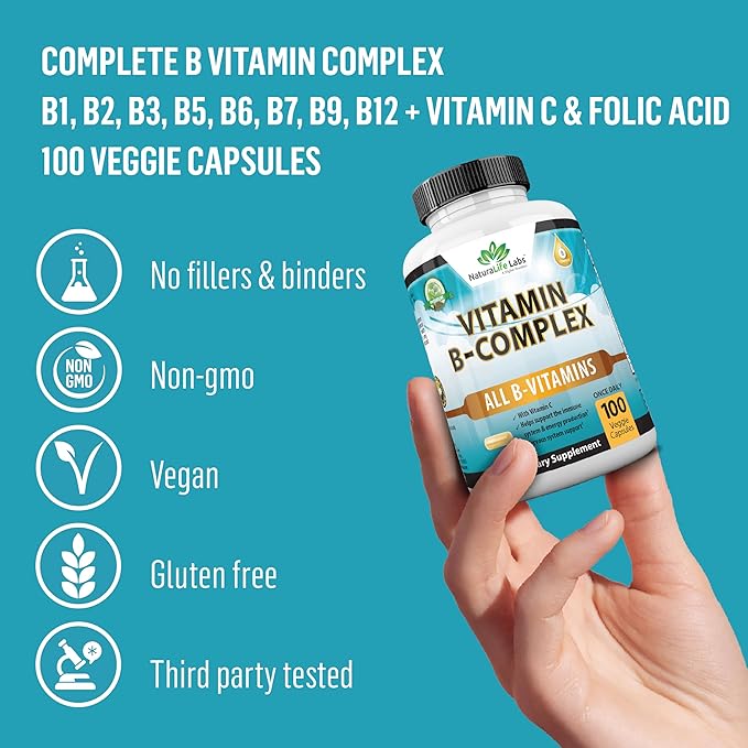 NaturaLife Labs Vitamin B Complex with Vitamin C and Folic Acid - B12, B1, B2, B3, Vitamin B5 Pantothenic Acid, B6, B7, B9 - Nervous System Support 100 Veggie Capsules