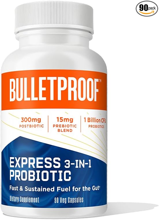 - Contains one 90-count bottle of Bulletproof Express 3-in-1 Probiotic capsules
