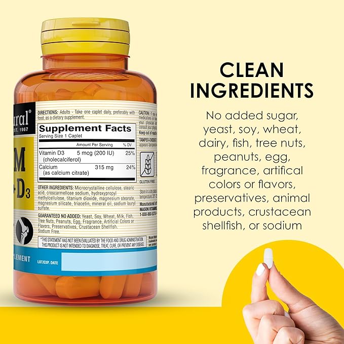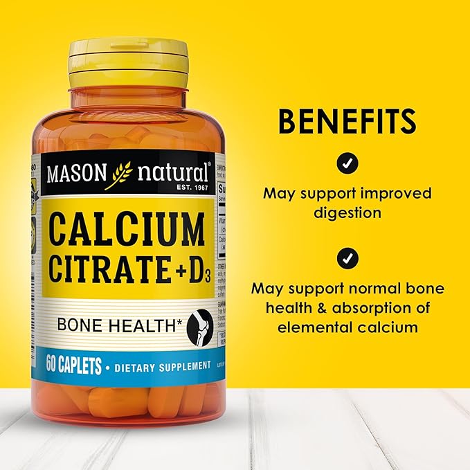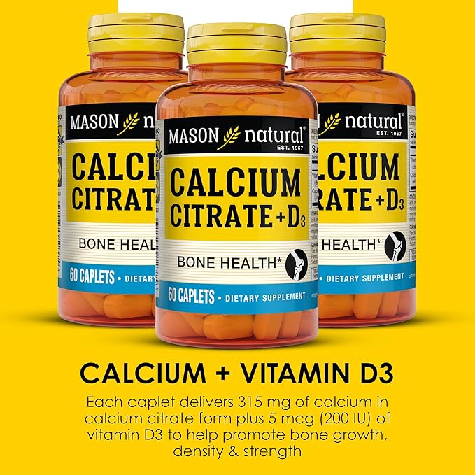 MASON NATURAL Calcium Citrate Plus Vitamin D3, 2 Month Supply, Strengthens Muscle Function & Bone Health, 60 Caplets