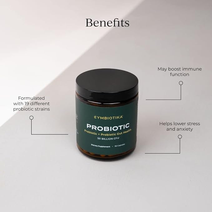 - PROBIOTIC SUPPLEMENT: Cymbiotika’s Probiotic supplement is crafted with 19 powerful probiotic strains, trademarked prebiotics, and a unique blend of herbal alchemy and amino acids to work together to restore, balance, and maintain healthy gut function.
