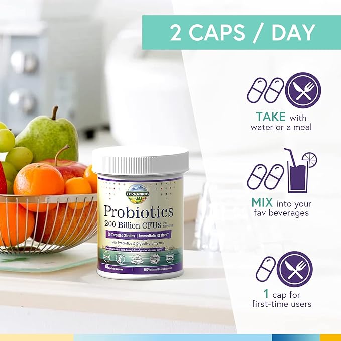 Terranics Daily Probiotics for Men & Women, 200 Billion 36 Strains Immediate Restore Probiotics, with Prebiotics & Enzymes, Healthy Regularity, Delayed Release, Shelf Stable, 60 Veggie Caps
