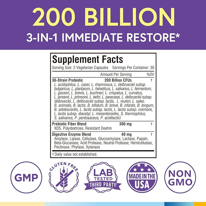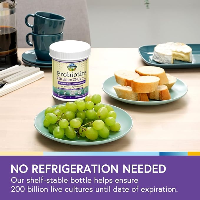 - Delayed Release & Shelf Stable: Each vegan capsule of Terranics immediate restore probiotics is scientifically made to give probiotics an added edge and the vitality needed to survive acid & bile so they can make it to your small intestine and colon. Our shelf-stable bottle helps ensure 200 billion live cultures until date of expiration. No refrigeration required.