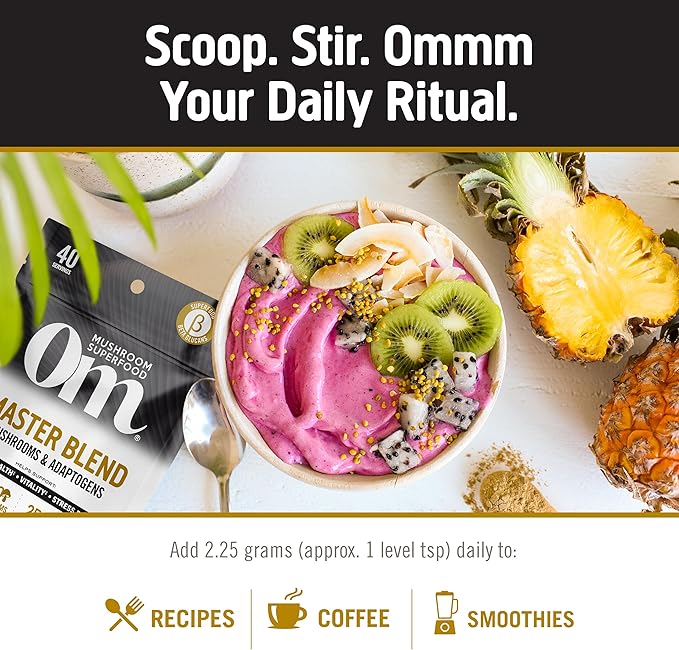 - Om Mushroom Superfood Master Blend Mushrooms & Adaptogens, Powder Supplement: Contains one 6.2/6.34 ounce pouch (67/80 servings, packaging may vary) of 10 species of USA grown, organic whole food mushrooms including Cordyceps, Reishi, Lion’s Mane, Turkey Tail, Chaga, and more. It’s a powerful master blend for vibrant health*