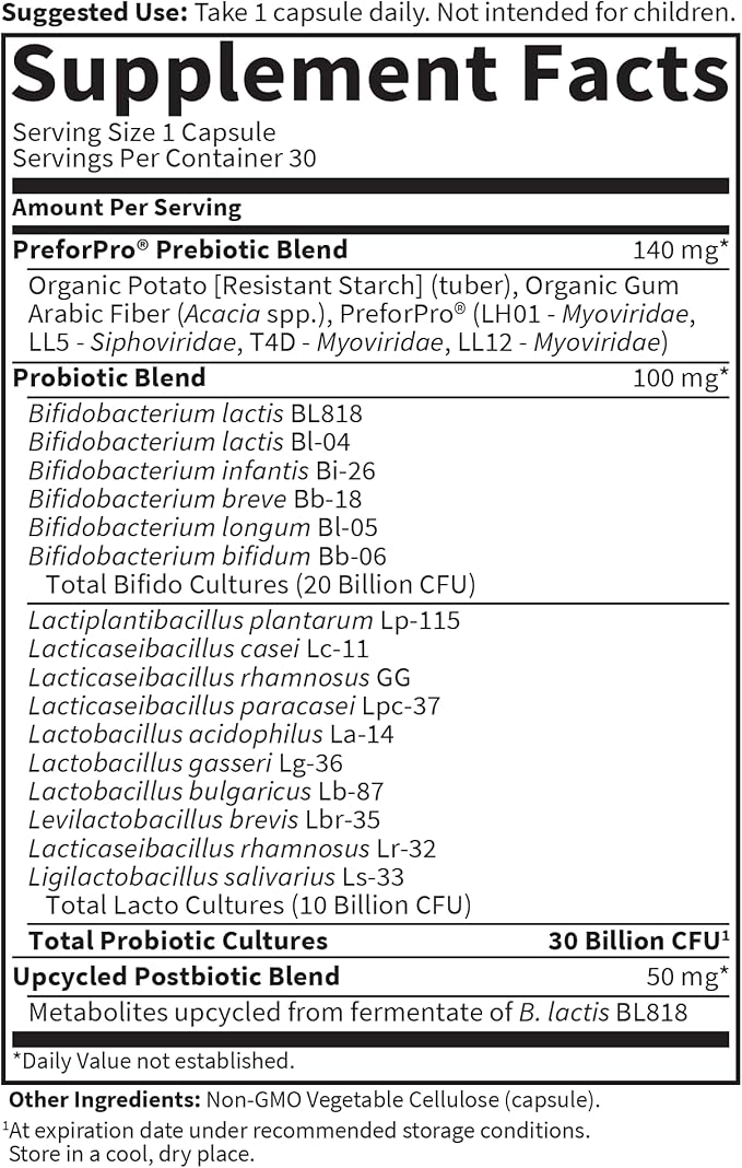 - Primary Supplement Type : Prebiotic Fiber + Probiotic + Postbiotic Supplement