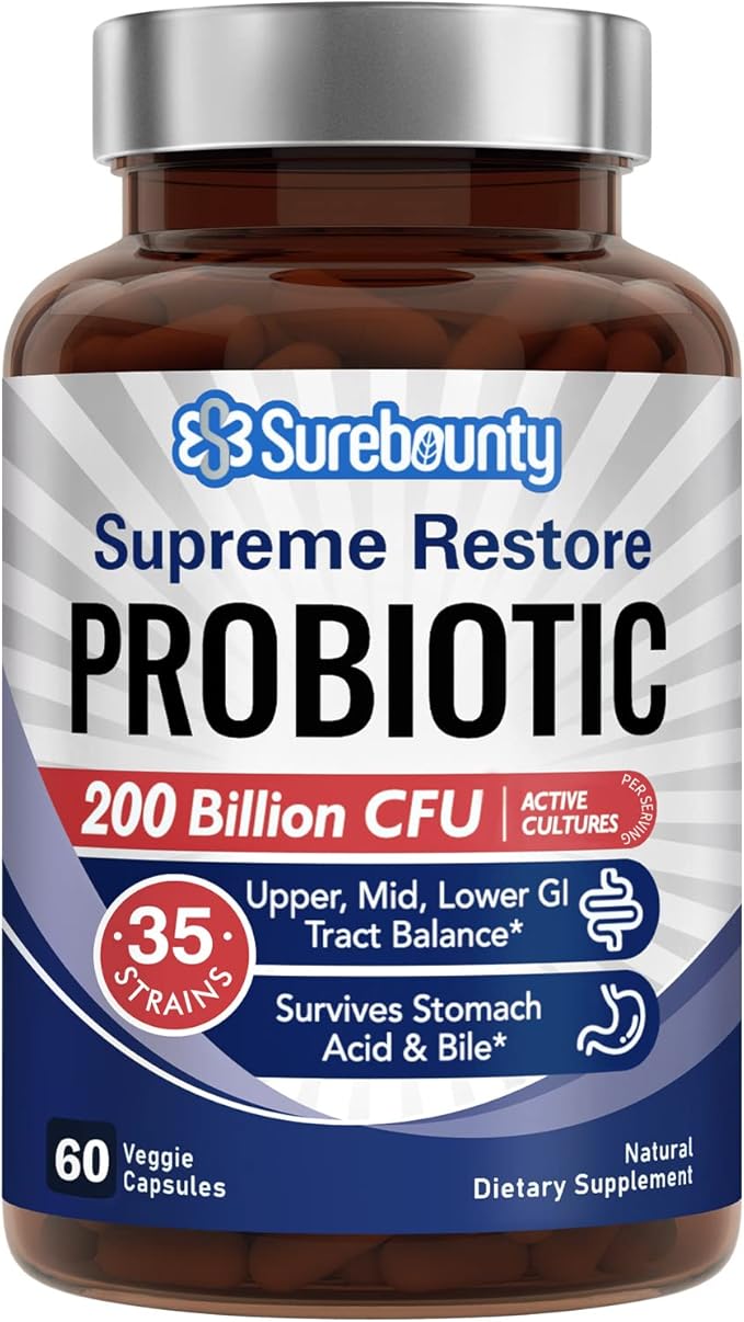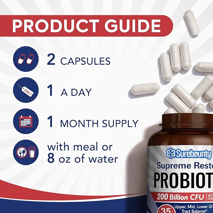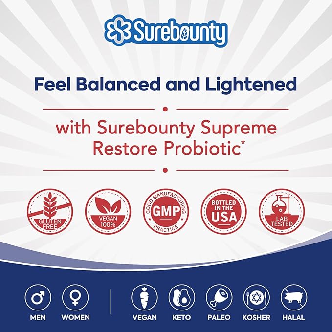 - Supreme Restore for Men & Women: Surebounty Supreme Restore Probiotic features a proprietary blend of 35 research-supported strains, giving your entire GI tract all the goodness it requires to thrive and function optimally.* The highest verified CFU count 200 billion is designed for extra restorative support during and immediately after times of disruption.* Take TWO capsules daily, Feel Lightened and Balanced with Surebounty Supreme Restore Probiotic.*