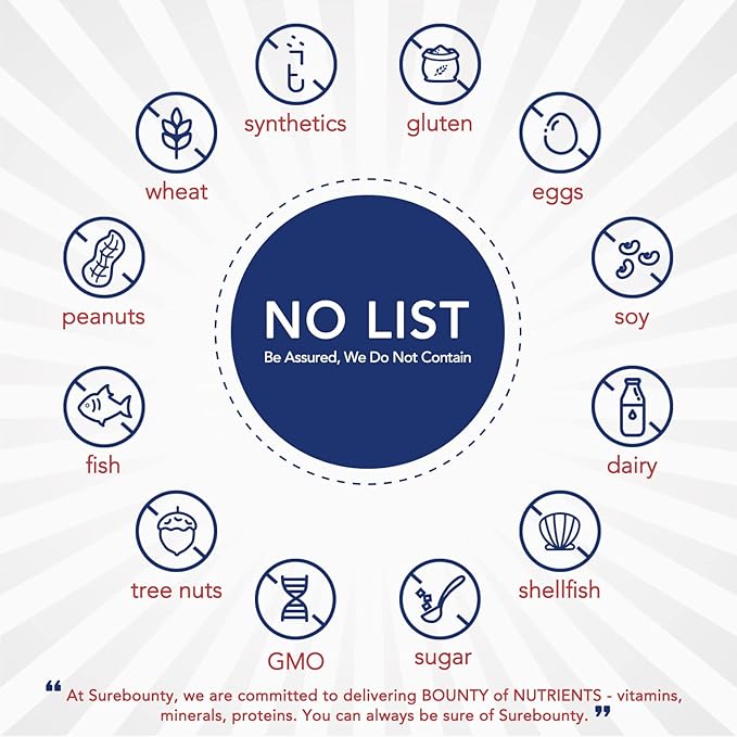 - No Allergens or Nasties: Surebounty has always been dedicated to formulating supplements that cater to people from all walks of life and can easily fit into their daily routines. We want you to enjoy the amazing benefits brought by our products without worrying about getting allergic. Be Assured: NO GMOs, soy, gluten, milk, sugar, egg, wheat, corn, nut, fish, shellfish. And never will you find Nasties like artificial ingredients, fillers, binders, or preservatives in Surebounty!