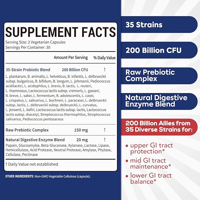 Probiotic for Men & Women, 200 Billion CFU 35 Strains, Prebiotics + Digestive Enzymes, Supreme Restore Probiotic Supplement, Upper, Mid, Lower GI Tract Balance, 60 Veggie Capsules, 1 Month