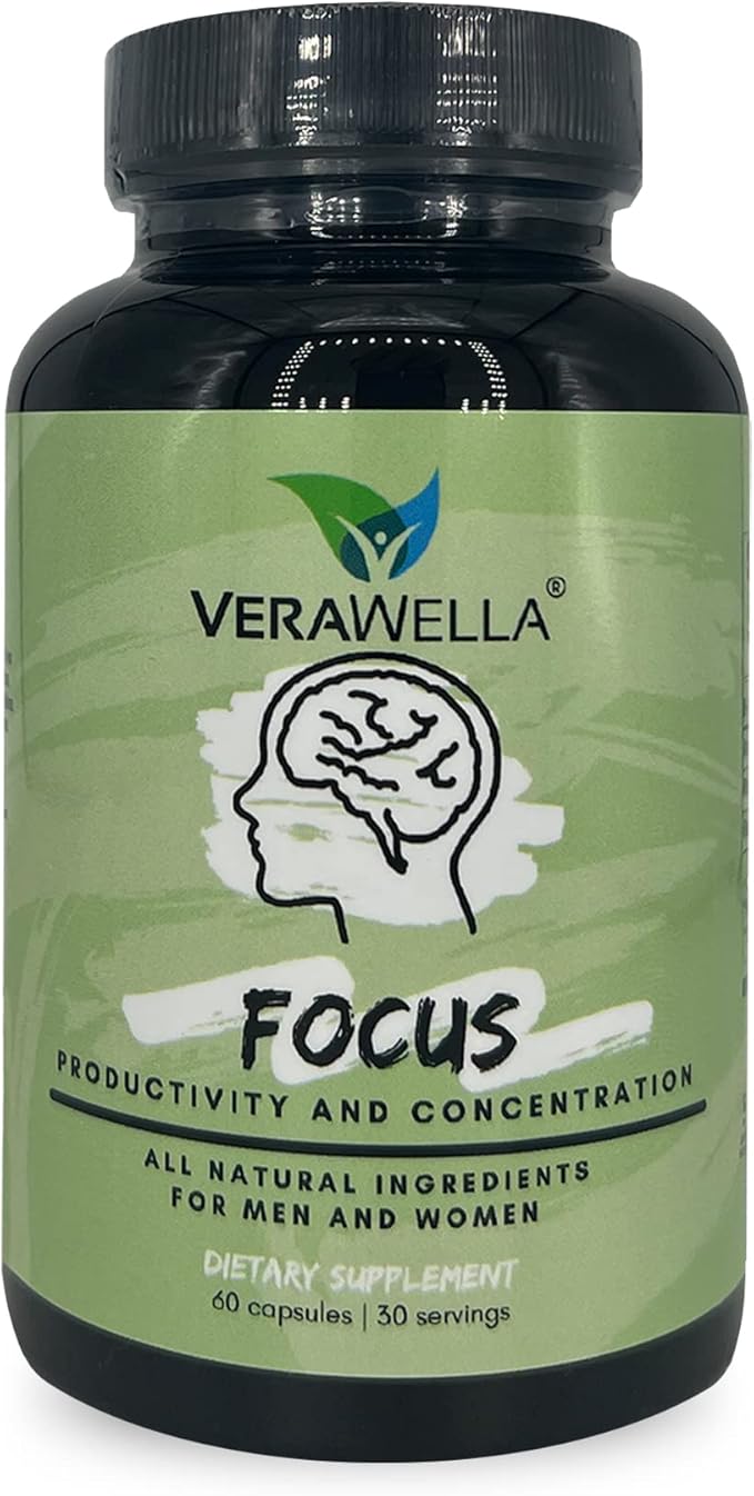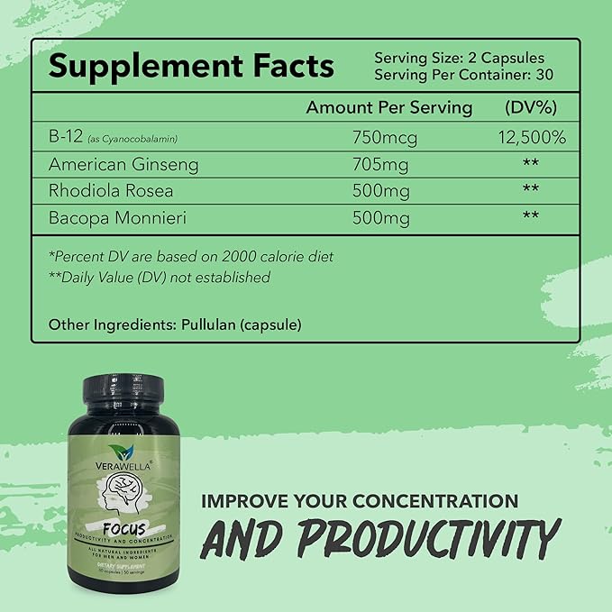 Focus, Anti Brain Fog, Brain Booster with American Ginseng, Rhodiola & Bacopa Monnieri, Supports Productivity and Concentration, 60 Capsules (30 Servings)