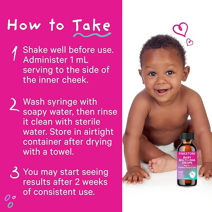 - CLEAN BABY VITAMIN DROPS: With so many children’s health supplements to consider, it’s a relief to finally find one in which you can be confident and comfortable—our essential baby supplements use superior-quality natural ingredients. Pink Stork Baby Multivitamin & DHA Drops are non-GMO and never include artificial flavors or dyes. Like all Pink Stork products, a female team of experts formulates our third-party tested baby drops.