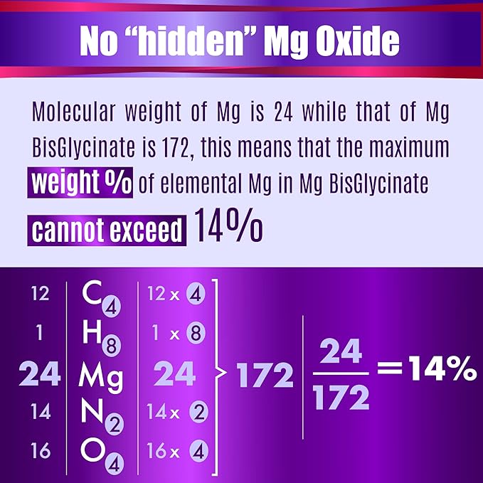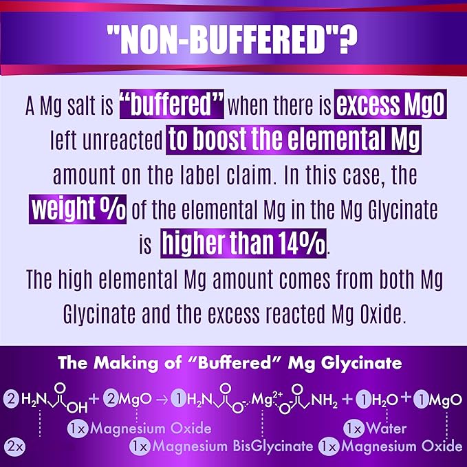 - FULLY CHELATED, NON-BUFFERED - Mg Glycinate (or also called Mg Bisglycinate) is an amino acid mineral chelated salt made from 2 molecules of Glycine and 1 molecule of Mg Oxide. A buffered Mg chelated salt means there is an excess of Mg Oxide that is left unreacted. As the presence of the unreacted Mg oxide adds to the total amount of elemental magnesium, many magnesium supplements are buffered to boost the amount of elemental magnesium. Folona Mg Glycinate is 100% chelated, non-buffered