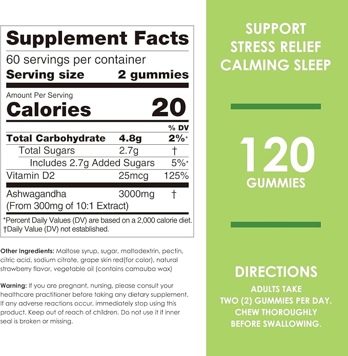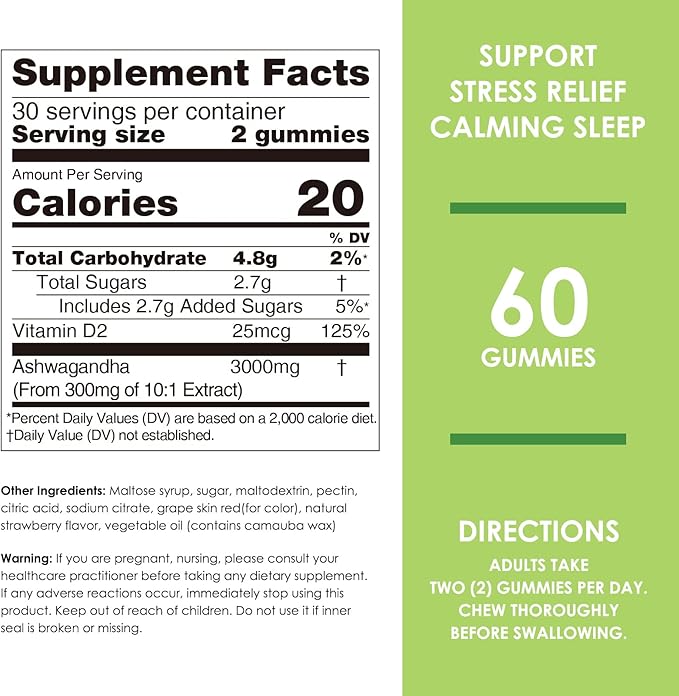- 3000mg Ashwagandha per serving, with vitamin D2 for added absorption, all you need is 2 ashwagandha gummies per day for complete mood support. All ingredients are safe, natural, independent, and 100% drug-free.