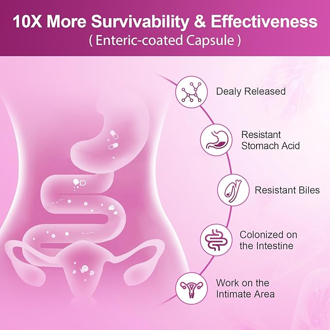 - Our Advantage: Advanced enteric-coated capsules boast an acid-resistant coating that won't irritate the stomach lining. Delayed-release properties ensure optimal strain delivery to the intestine and vagina, maximizing effectiveness. Formulated with all-natural, dairy-free, and Non-GMO ingredients. No refrigeration required. We stand behind our probiotics' potency until the expiration date and offer a return policy if it does not meet your expectations.