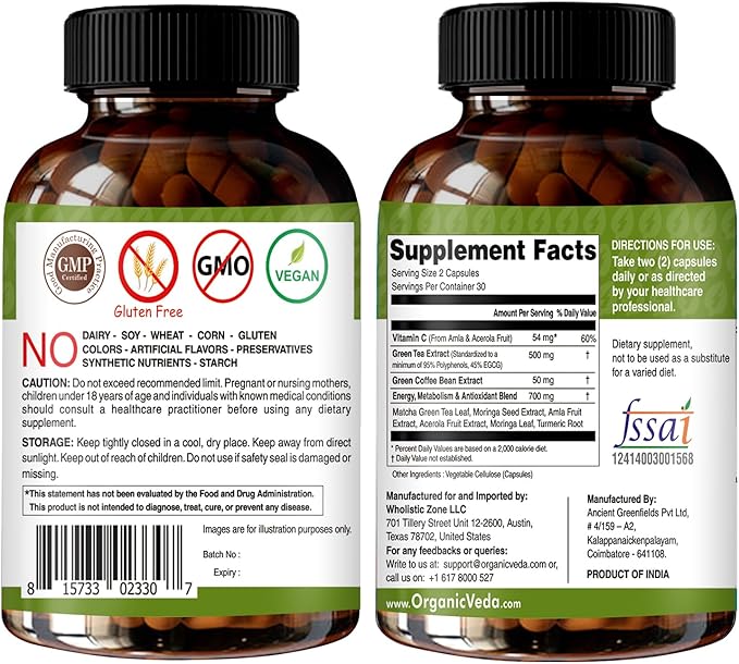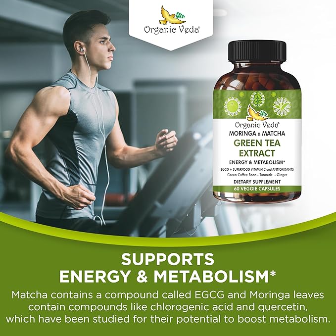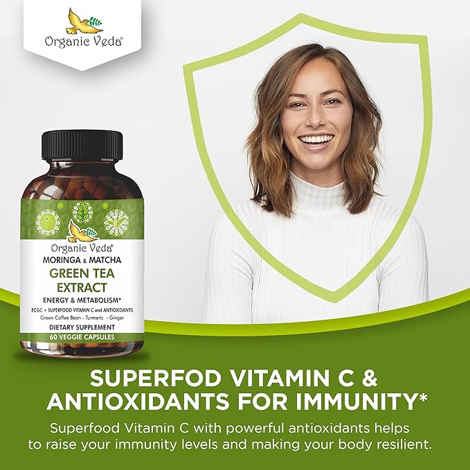Organic Veda Green Tea Extract ECGC Capsules - Antioxidants Rich Matcha, Green Coffee Bean, Turmeric, Moringa, Vitamin C - Energy, Metabolism, Brain, Immune & Heart Health Supplement - 60 Pills