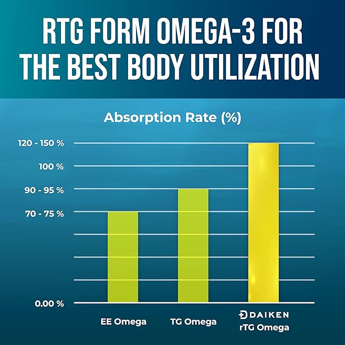 DAIKEN rTG Omega 3 1000mg, High Absorption & Burpless Fish Oil 1200 mg, Mini Fish Oil Softgels for Healthy Heart, Brain and Dry Eyes Support, 60 Small Softgels