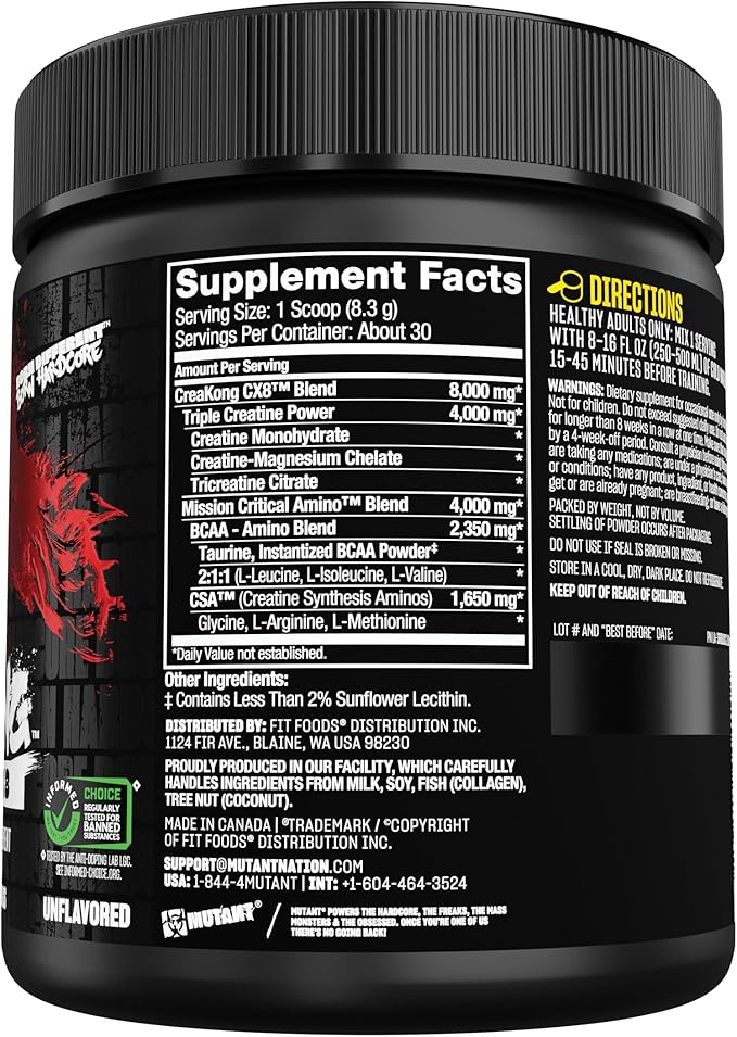 - Supercharged Creatine + Amino Formula – MUTANT CREAKONG CX8 combines a powerful 4g dose of triple creatine blend (Creatine Monohydrate, Creatine-Magnesium Chelate, Tricreatine Citrate) with 4g of Mission Critical Aminos (including BCAAs and Taurine) for enhanced muscle strength, size, and performance.