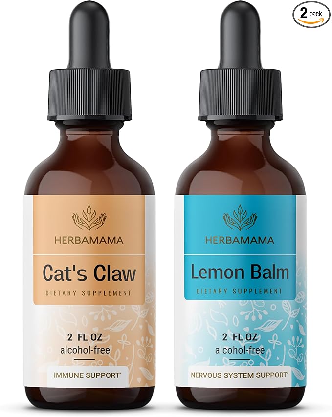 Herbamama Liquid Drops Kit - Bundle of Cat's Claw Extract 2 fl oz and Lemon Balm Tincture 2 fl oz - Vegan Herbal Supplement Liquid Extract - Non GMO, Sugar & Alcohol-Free - 2 Pack