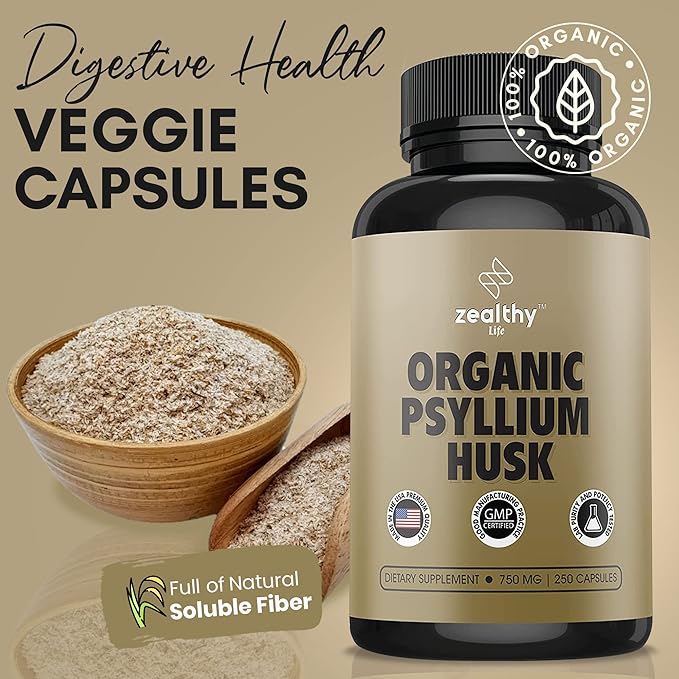 Organic Psyllium Husk Capsules, Natural Fiber Supplement for Gut Health* - Alternative to Psyllium Husk Powder, Zealthy Life, 250 Capsules