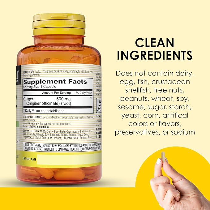 MASON NATURAL Whole Herb Ginger 500 mg, 6 Month Supply, Natural Herbal Supplement, 60 Capsules (3 Pack)