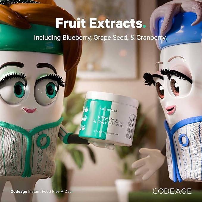- 7 Non-GMO Veggies Supplement: Codeage Instantfood Five a Day is a vegan whole food blend enriched with 7 green foods and extracts, including broccoli, onion, tomato, carrot, spinach, kale, and brussels sprout in a capsule form. One daily serving of this healthy greens fruits and vegetable vitamins formula offers the equivalent of 3 servings of vegetables phytonutrients.