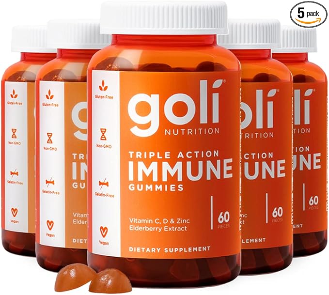 - Vegan, Non-GMO, Gluten-free & Gelatin-free: Each bottle of Goli Triple Action Immune Gummies contains 60 delicious vegan, non-GMO, gluten-free, and gelatin-free gummies.