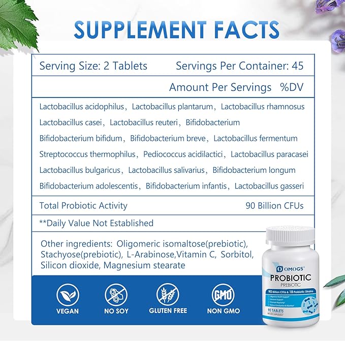 - Probiotics for Adults: Probiotic supplement contains 90 tablets, 2 tablets per day for 45 days. Probiotic contains organic prebiotics and natural vegan probiotics, can also help bloating relief, constipation and support metabolism.