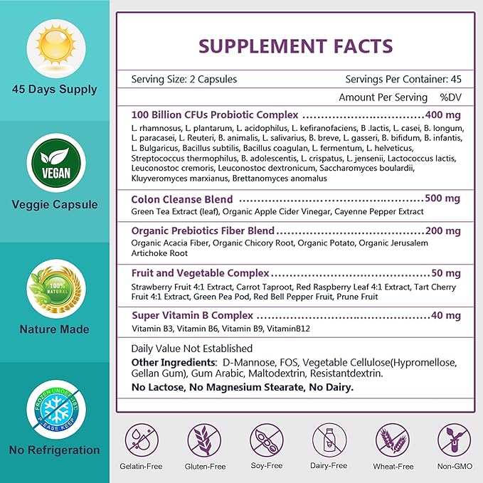 - 5 in 1 Probiotics for Overall Health: Our probiotics for women and men contain 100 billion CFUs, PROPRIETARY COLON CLEANSE COMPLEX, PREBIOTICS FIBER, FRUIT & VEGETABLE COMPLEX, and VITAMIN B to support your body healthy. Probiotics broad spectrum contains 30 strains to support intestinal strain diversity, suitable for people over 10 years old, probiotics are enteric coated, have no refrigeration, and can resist stomach acid and bile, increasing the absorption rate of probiotics by 10 times.