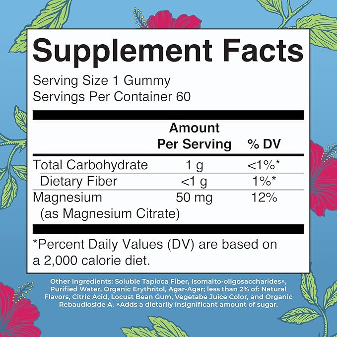 - Magnesium Citrate Magnesium Supplement: Per Serving (1 Gummy): Magnesium (as Magnesium Citrate): 50 mg. Other Ingredients: Soluble Tapioca Fiber, Isomalto-oligosaccharides^, Purified Water, Organic Erythritol, Agar; less than 2% of: Natural Flavors, Citric Acid, Locust Bean Gum, Black Carrot Color, Organic Stevia Leaf Extract, Organic Sunflower Oil.