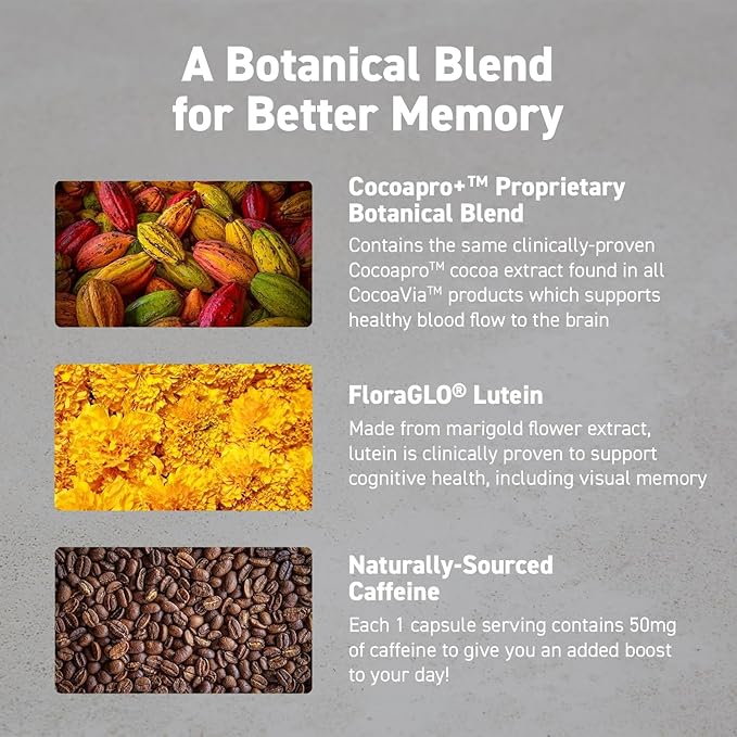 - BACKED BY SCIENCE: A unique plant-based formula designed with Cocoapro+ proprietary blend, with clinically-proven Cocoapro cocoa extract and bioactive flavanol (-)- epicatechin, plus clinically-proven FloraGLO Lutein, and naturally-sourced caffeine – all in just one capsule to help you stay sharp, keep you focused, boost memory, and support brain function
