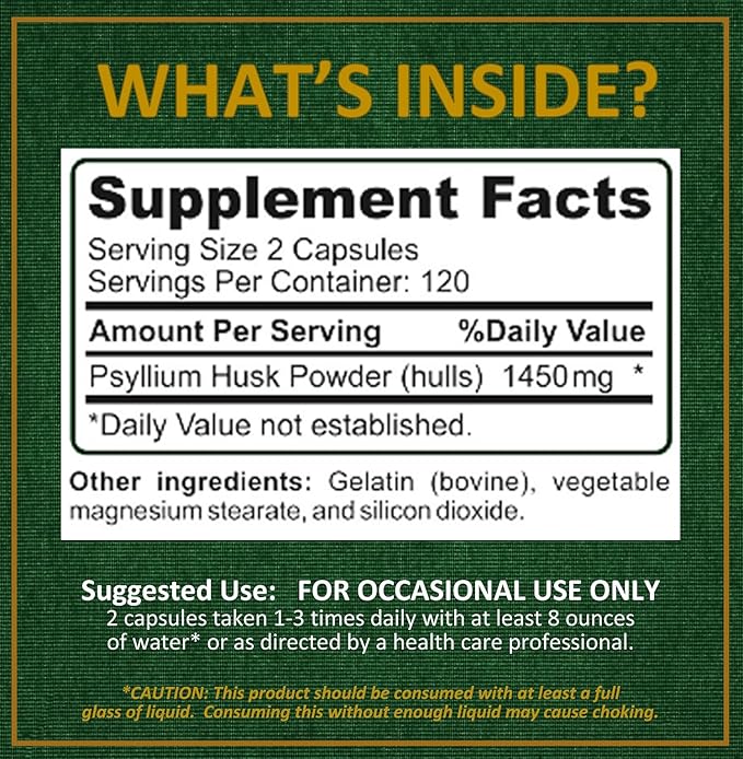 - CONVENIENT DIETARY FIBER - Our fiber supplement powder capsules are made with whole psyllium husk and provide a convenient and easy-to-swallow option. Simply take our Psyllium Husk capsules with a full glass of water.