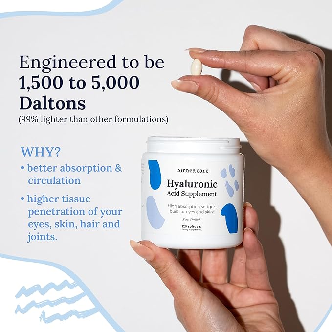 - COMPLETE EYE CARE & BEYOND | CorneaCare’s Hyaluronic Acid Supplements are your all-in-one solution for relieving eye dryness, redness, irritation, burning, pain, crusting, flaking, discharge, gritty sensation, light sensitivity, and blurry vision. But that’s not all—these supplements also enhance skin hydration, improve hair quality, and strengthen joints and bones for overall wellness.