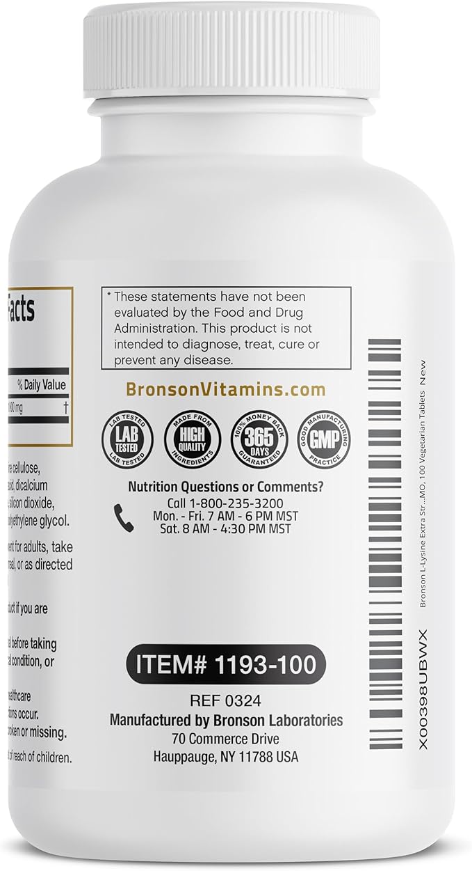 - Extra Strength Vegetarian Tablets: Bronson L-Lysine Extra Strength provides a superior 1000 MG of high quality L-Lysine per vegetarian tablet. L-Lysine is an essential amino acid that is obtained through foods and supplementation.
