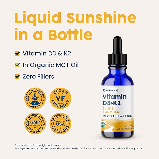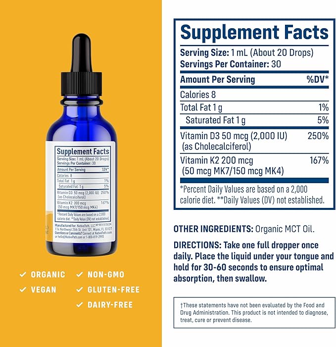 - COMBINES VITAMIN D3 & K2: Our potent formula combines 2,000 IU of Vitamin D3 and 200 mcg of Vitamin K2 in a base of Organic MCT Oil. This triple-action blend works synergistically to supercharge bone health and immune function while promoting optimal nutrient absorption in the body.