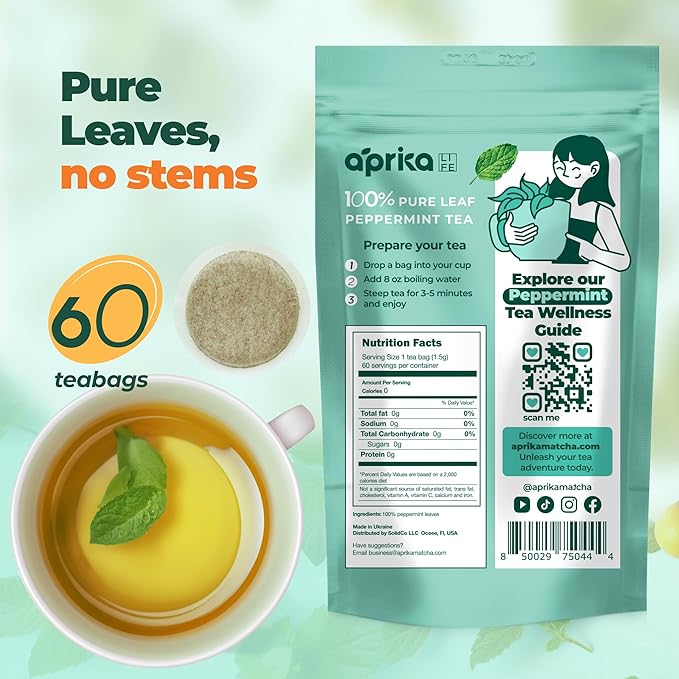 100% Pure Peppermint Tea - Only Mint Leaves without Stems, Peppermint Tea Bags, Caffeine-Free Tea Bags, 60 count, by Aprika Life
