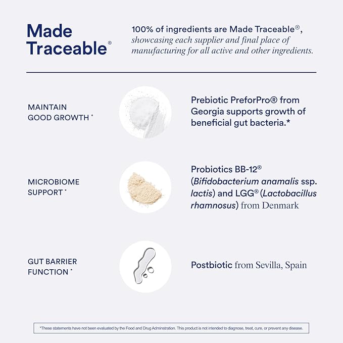 - SYNBIOTIC+ 3-IN-1 FORMULA: with prebiotics, probiotics and postbiotics to support a balanced gut microbiome. Our formula is Made Traceable with 11b CFUs with two of the world's most clinically studied probiotic strains. Our visible supply chain tells you what you're putting into your body where it comes from and why. Plus it's designed to thrive with our delayed-release capsule to help reach the colon (not the stomach), an ideal place for probiotics to survive and grow.*