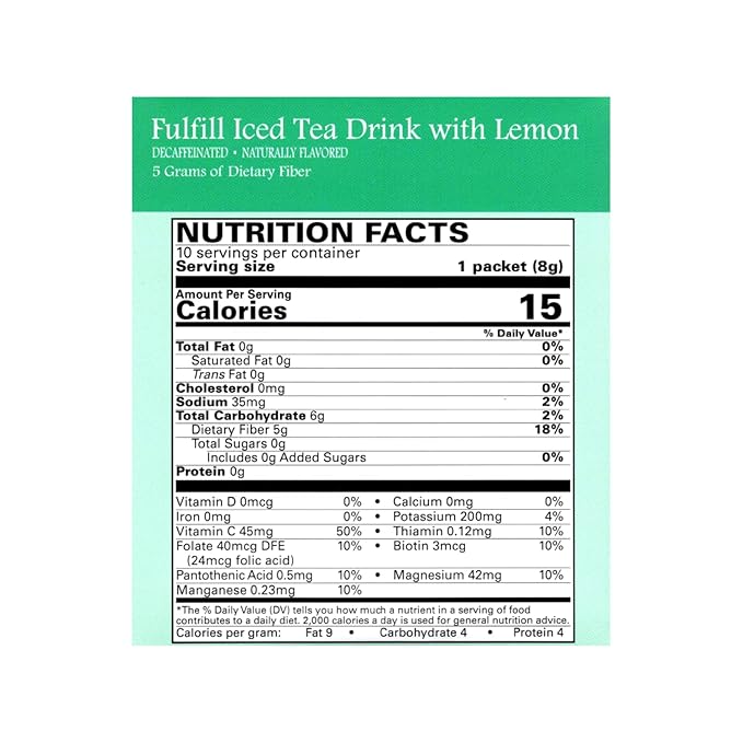 - Refreshing and Healthy Choice: Fulfill Iced Tea Drink with Lemon is a perfect blend of health and taste. With each serving containing 5 grams of dietary fiber, this beverage aids in digestion and promotes a healthy gut. The decaffeinated nature ensures you can enjoy it any time of the day without worrying about sleep disturbances. Ideal for those who are health-conscious but still crave a delicious and refreshing drink.