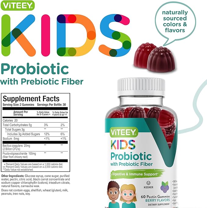 - DIGESTIVE HEALTH - IMMUNE HEALTH - REGULARITY SUPPORT - Our specially formulated Kids Probiotics Gummies with Prebiotic Fiber deliver the perfect combination that can help to support your digestive health and overall immune system. Viteeys probiotics for kids constipation relief gummy ingredients are perfectly formulated and combined for kids and teens. Easy & convenient to take at home or on the go.