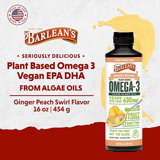 Barlean's Ginger Peach Vegan Omega 3 Supplement, Liquid Algae Oil with 630 mg EPA & DHA, Plant Based Omegas from Algal Oil, Non-GMO & Gluten Free, 16 oz