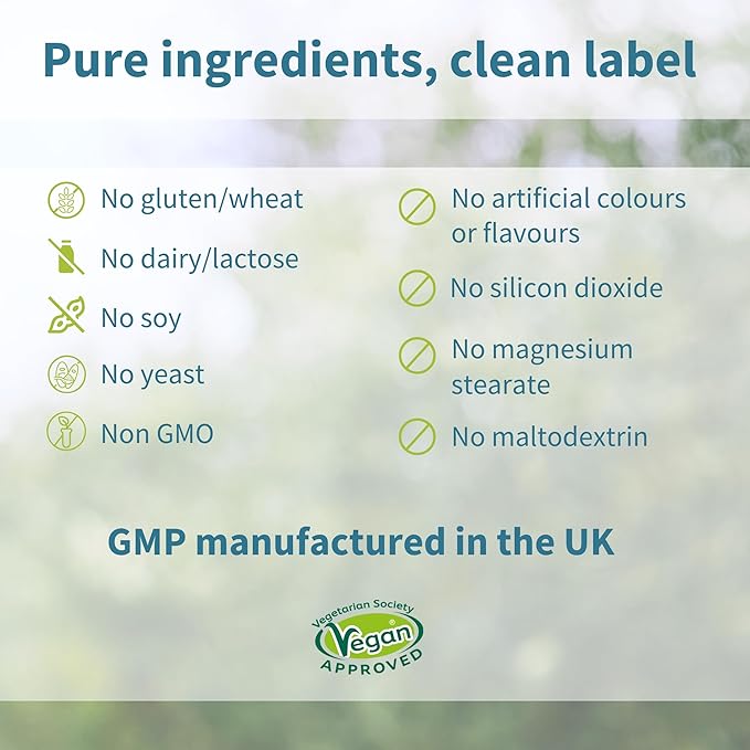 - PURE & CLEAN LAB VERIFIED: certified vegan, non-GMO, no artificial colors or flavors, hypoallergenic ingredients with no unpleasant fillers (silicon dioxide, magnesium stearate or titanium dioxide). GMP-manufactured in the UK, Not tested on animals, compatible with halal and kosher diets