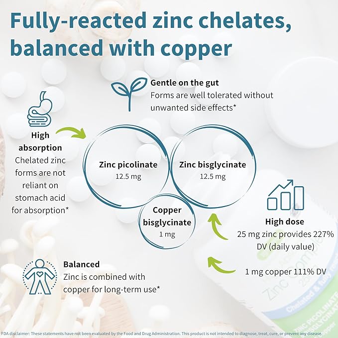 - HIGH ABSORPTION: fully-reacted zinc picolinate 25mg and glycinate (as bisglycinate) prevent mineral competition by targeting more efficient uptake pathways, boosting levels 40% higher than standard zinc supplements (gluconate)