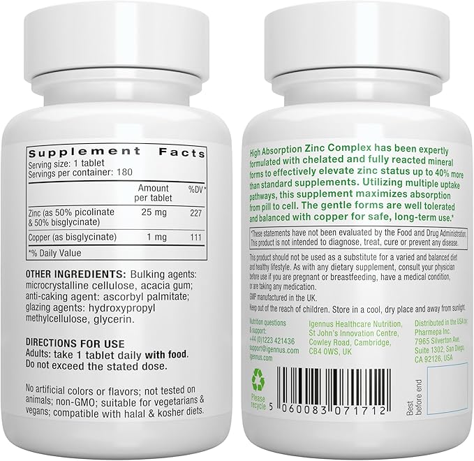 Igennus Chelated Zinc 25mg with Copper, Picolinate & Bisglycinate, Clean Label & High Absorption Complex, Supplement for Women & Men, Vegan, Immune, Skin and Cellular Health, 180 Tablets