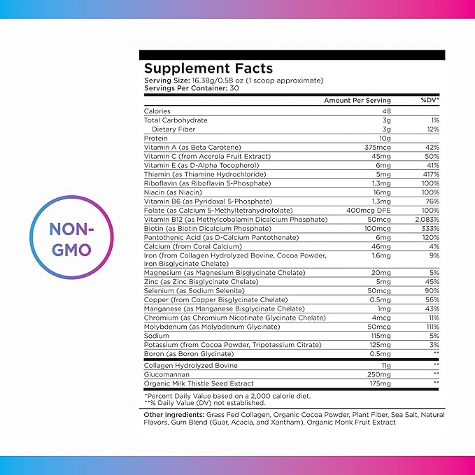 - Special Ingredients : Vitamin A (as Beta Carotene), Vitamin C (from Acerola Fruit Extract), Vitamin E (as D-Alpha Tocopherol), Thiamin (as Thiamine Hydrochloride), Riboflavin (as Riboflavin 5-Phosphate), Niacin (as Niacin), Vitamin B6 (as Pyridoxal 5-Phosphate), Folate (as Calcium 5-Methyltetrahydrofolate), Vitamin B12 (as Methylcobalamin Dicalcium Phosphate), Biotin (as Biotin Dicalcium Phosphate), Pantothenic Acid (as D-Calcium Pantothenate), Calcium (from Coral Calcium), Iron (from Collagen Hydrolyzed Bovine, Cocoa Powder, Iron Bisglycinate Chelate), Magnesium (as Magnesium Bisglycinate Chelate), Zinc (as Zinc Bisglycinate Chelate), Selenium (as Selenium Chelate), Copper (from Copper Bisglycinate Chelate), Manganese (as Manganese Bisglycinate Chelate), Chromium (as Chromium Nicotinate Glycinate Chelate), Molybdenum (as Molybdenum Glycinate), Chloride, Sodium, Potassium (from Cocoa Powder, Tripotassium Citrate), Boron (as Boron Glycinate), Collagen Hydrolyzed Bovine, Glucomannan, Organic Milk Thistle Seed Extract, Grass Fed Collagen, Organic Cocoa Powder, Sea Salt, Natural Flavors, Gum Acacia, Organic Monk Fruit Extract Vitamin A (as Beta Carotene), Vitamin C (from Acerola Fruit Extract), Vitamin E (as D-Alpha Tocopherol), Thiamin (as Thiamine Hydrochloride)… See more