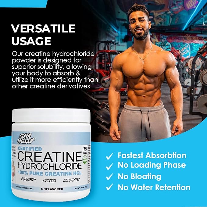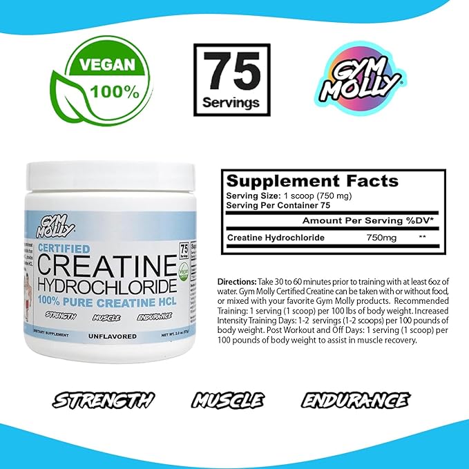 - Product Benefits : Gym Molly Certified Vegan Creatine Hydrochloride is a unique advanced form of creatine. It is more soluble and bioavailable than all other creatine derivatives. Gym Molly Certified Vegan Creatine Hydrochloride is a unique advanced form of creatine. It is more soluble and bioavailable than all other creatine derivatives.