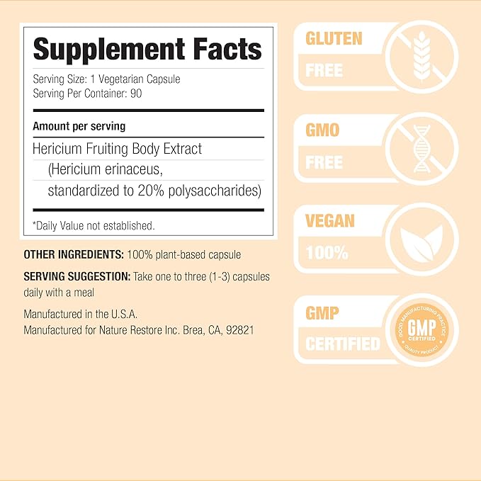 Nature Restore Hericium Erinaceus Extract Mushroom Supplement, 90 Capsules, 20% polysaccharides