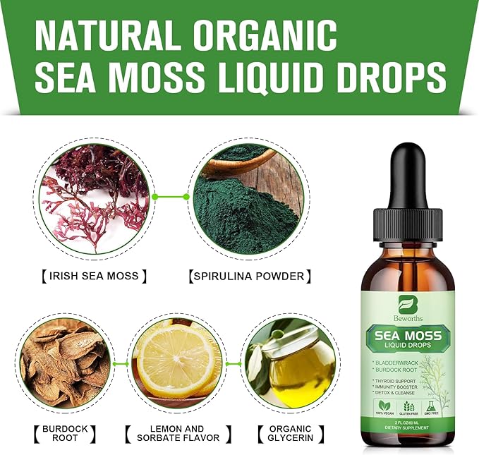 - 【Organic Nutrient-Rich Sea Moss】: Our organic Irish sea moss liquid drops are powerful drinking energy supplements. It includes the ingredients Irish sea moss, burdock root, and spirulina powder to deliver vitamins and minerals for your body's maximum nourishment!
