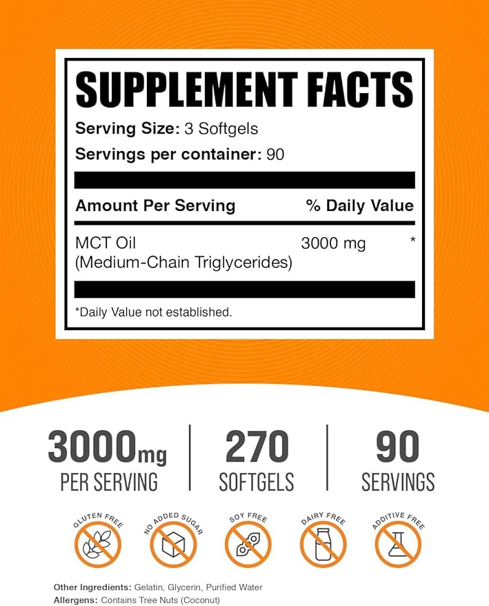 BulkSupplements.com MCT Oil Softgels - Medium Chain Triglyceride, MCT Supplement, MCT Oil 3000mg - for Energy Support, Gluten Free, 3 Softgels per Serving, 270 Count (Pack of 1)