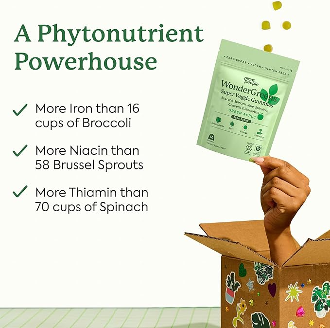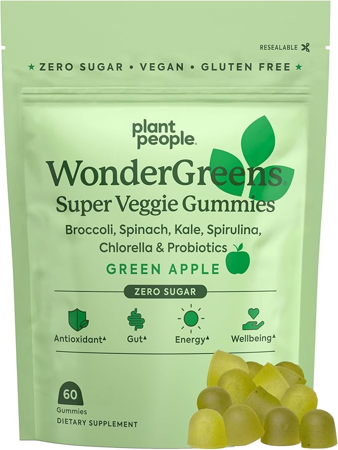 Plant People WonderGreens Veggie Gummies Super Greens with Probiotics Multivitamin Support Gummy for Wellbeing, Energy, Immune and Gut Health, Green Apple Flavor (60 Count)