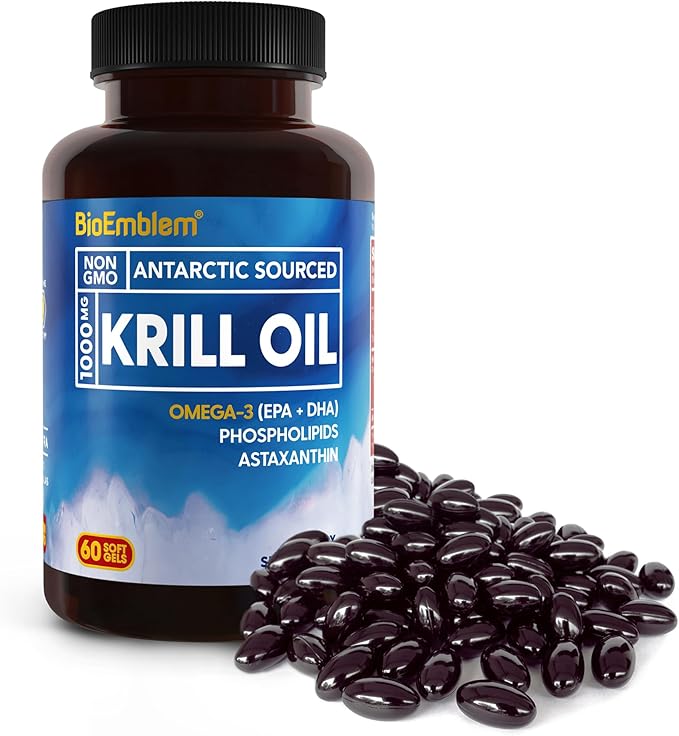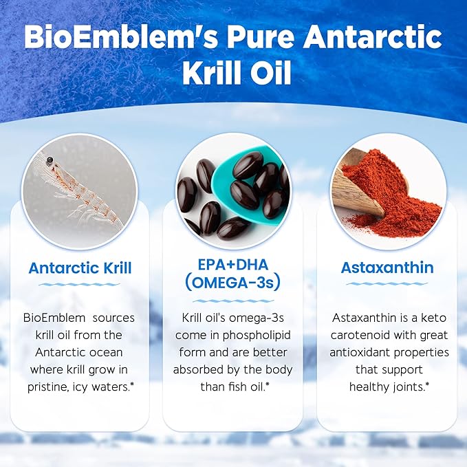 - ANTARCTIC KRILL OIL, RICH IN OMEGA-3s: BioEmblem's premium krill oil is sustainably harvested from the pristine waters of the Antarctic Ocean. Each 1000mg serving delivers 340mg of essential omega-3 fatty acids, 136mg of EPA, 64mg of DHA, along with phospholipids and astaxanthin.